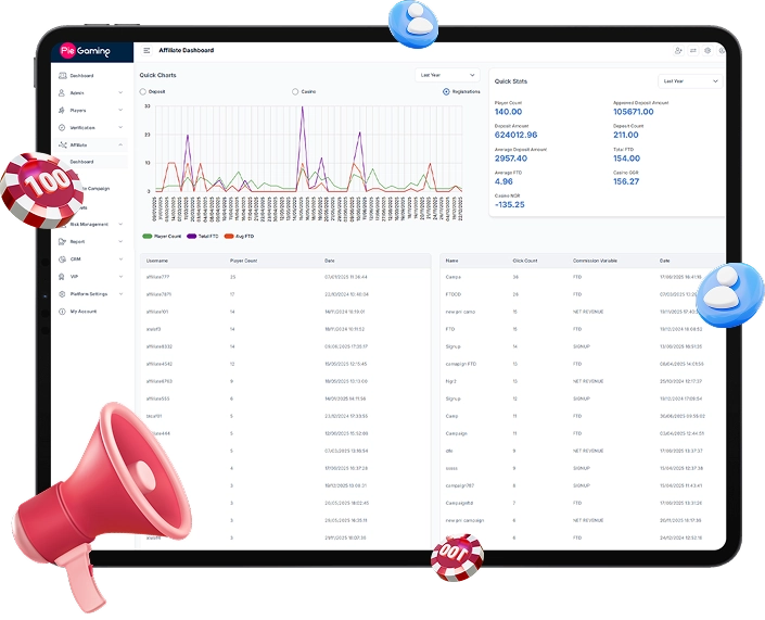 PieGaming combines affiliate tracking and Player Account Management in one platform. Manage players, deposits, campaigns, and commissions from a single dashboard with accurate, unified data.